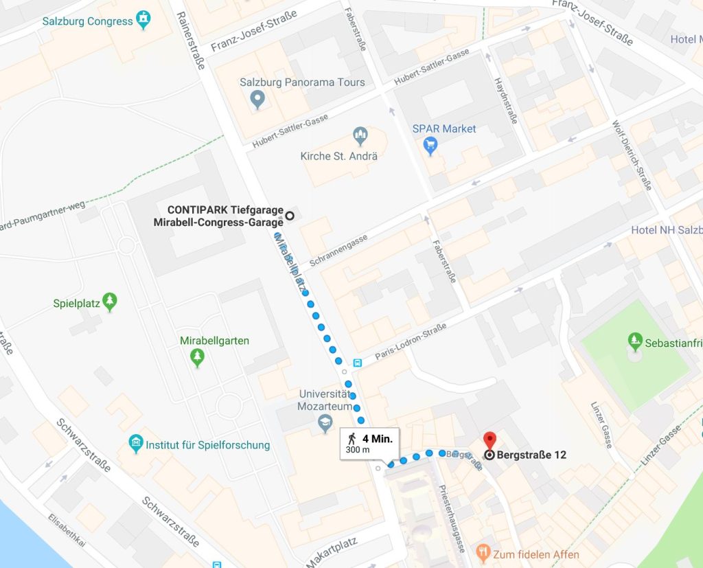 Von der CONTIPARK Tiefgarage (Mirabell-Congress-Garage gehen Sie 300 m zu Fuß in unsere Praxis. Diese befindet sich im KunstQuartier mitten in der Salzburger Altstadt, in der Bergstraße 12, Stiege 1, 4. Stock.
